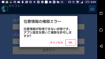 - アプリを始めて起動したときに、「位置情報の権限エラー 位置情報が取得できない状態です。アプリ設定を開いて権限を許可しますか?」というダイアログが表示されますので、「OK」をタップしてください。