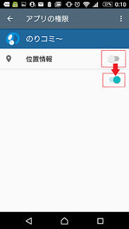 - 「アプリの権限」画面が開きますので、「位置情報」のトグルボタン(オン・オフボタン)をタップし、オンの状態にしてください。